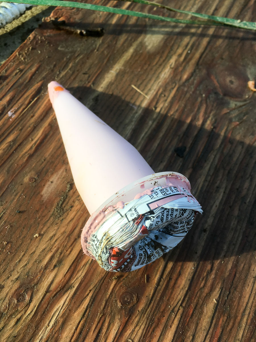 It comes in sausage tubes which require a special caulking gun – not the usual Home Depot/Lowes product range at all. It’s an excellent caulking system: high capacity tubes, the nozzle doesn’t dry up and clog so easily. Best of all there is no bulky tube to dispose of later. Just the thin compressed skin. Here’s a photo of the reusable nozzle and the used skin.