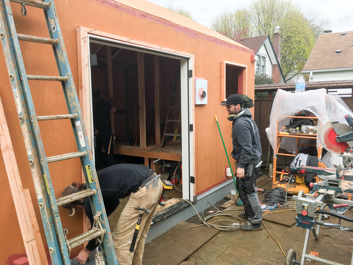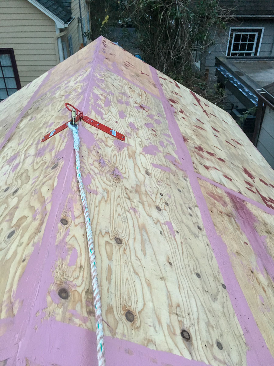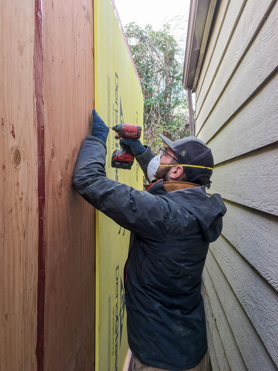 The north side of the ADU is fire-rated as it’s within 3 feet of the property line. This means DensGlass paneling goes over the ply sheathing on the north side, the first 4 feet of the upper roof deck will be fire-resistant plywood, and the interior north wall will be covered in fire-rated gypsum rather than standard drywall.
