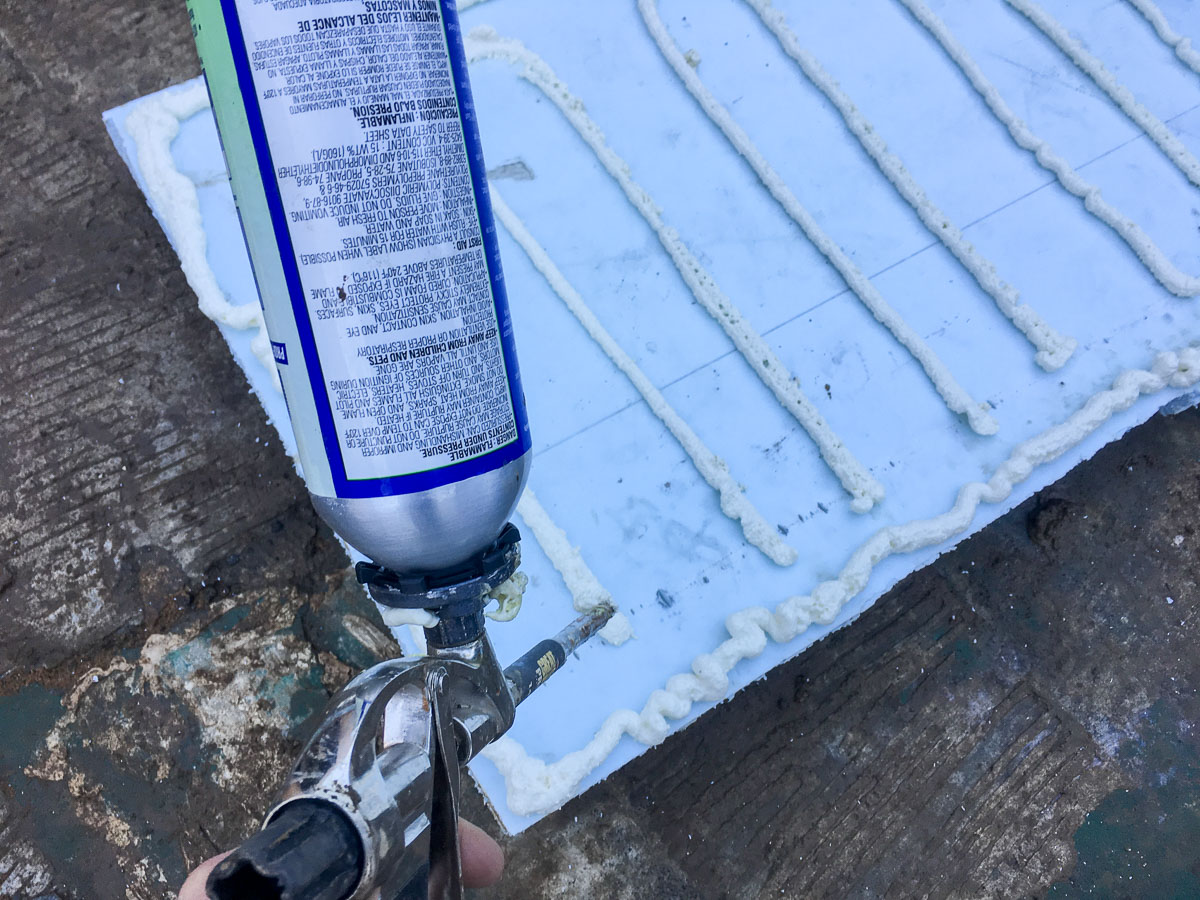 I’m insulating the outside of the slab using 2-inches of XPS foamboard. On the main house I used Hilti Insulation Anchors to attach the foam to the concrete. This requires drilling into the concrete slab. However Hammer & Hand use an adhesive foam – Dow ENERFOAM Foam Sealant – to glue the foam to the concrete. It’s an expanding foam – similar to Dow’s Great Stuff range – but with an adhesive mixed in. You can find more information here: