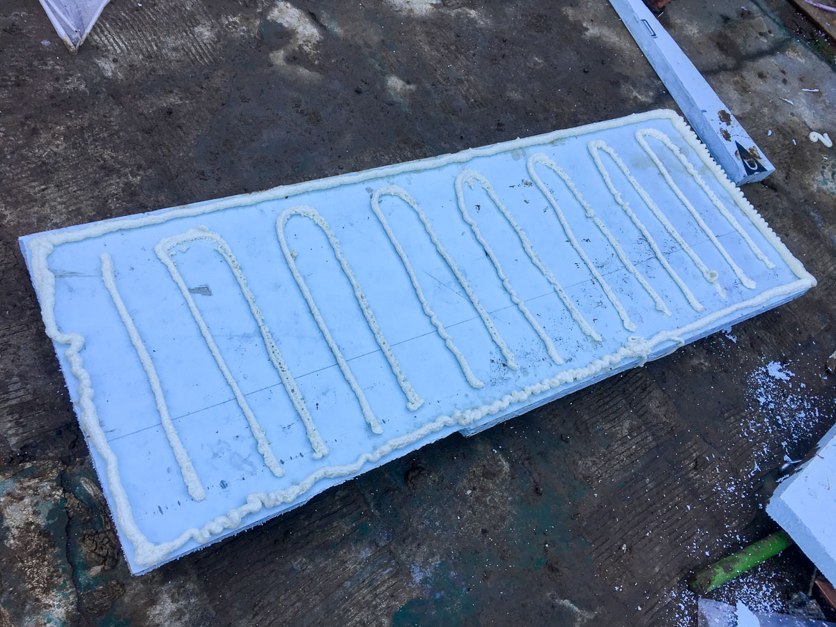 I used R-Guard Joint and Seam Filler wherever there was a gap between two plywood sheets, also between the framing, the concrete slab and the slab insulation foam. I also used it to fill in any large holes or imperfections in the plywood outer layer.