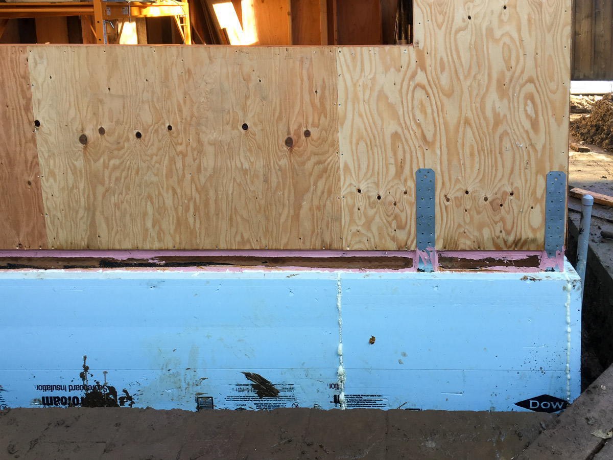 Tamoseal-coated HardiePanels attached to the XPS foam. (Tamlyn flashing strip visible on the right.)