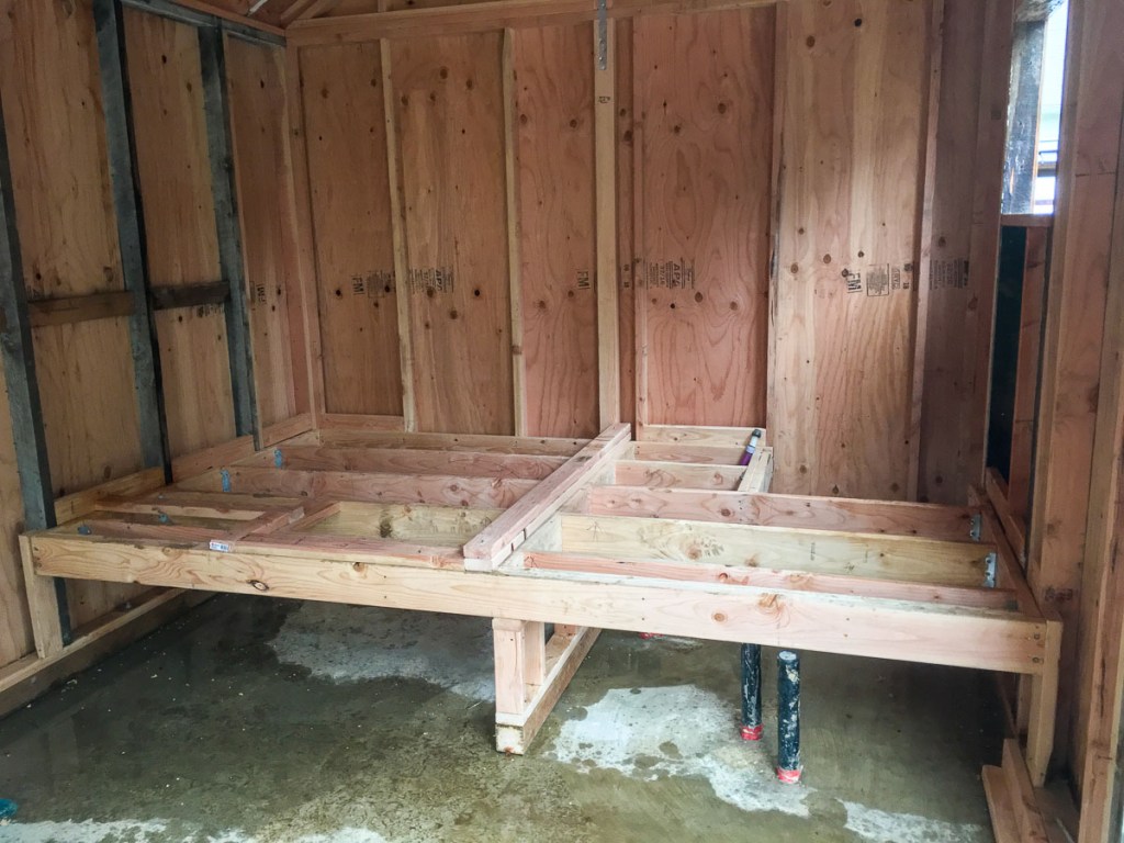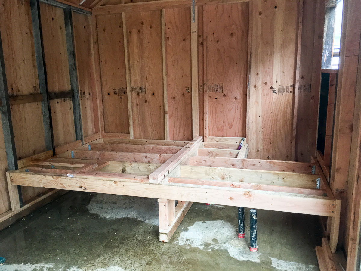 The platform is built – 2x6s on hangers. The bathroom is on the left, kitchen on the right. The bed slides under the cavity to the left. The right will be used for plumbing, and electrical runs.