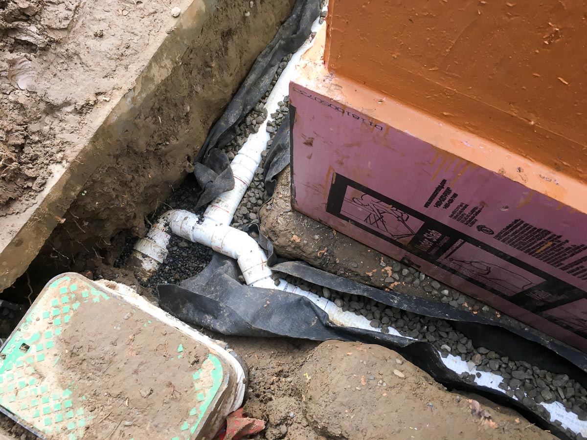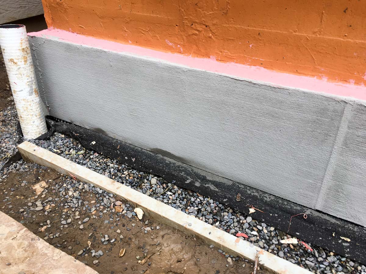 TREMproof 250GC waterproof coating has already been applied to the 2-foot deep slab edges, then 2 inches of XPS foam glued on using Dow EnerFoam. Now it was time to complete the slab drainage and protect and finish the above-ground part of the slab
