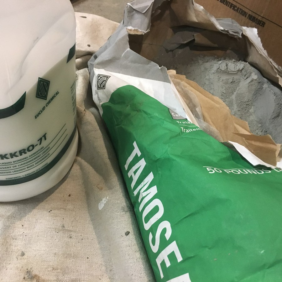 First cut the panels into foot-wide strips (for my foundation 8-inches above grade, 4 below), then apply one coat of Tamoseal on the front surface and four edges using a mason’s brush. Mason’s Supply in SE Portland has all the materials. The older guy at Mason’s took time to write down the mixing rations for the Tamoseal and the bonding acrylic for my application. The customer service there is excellent.