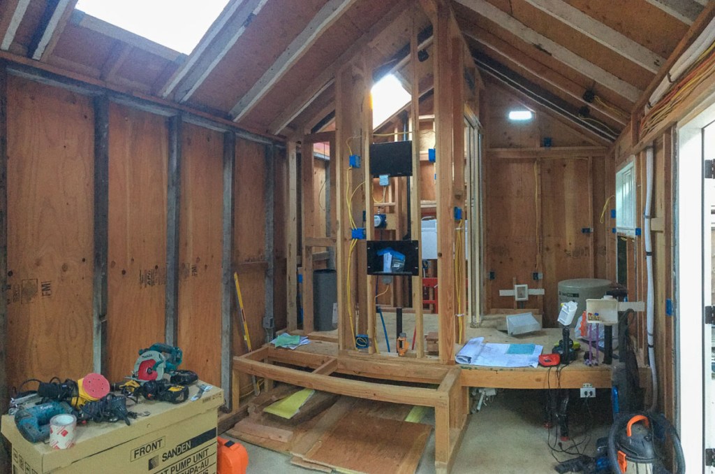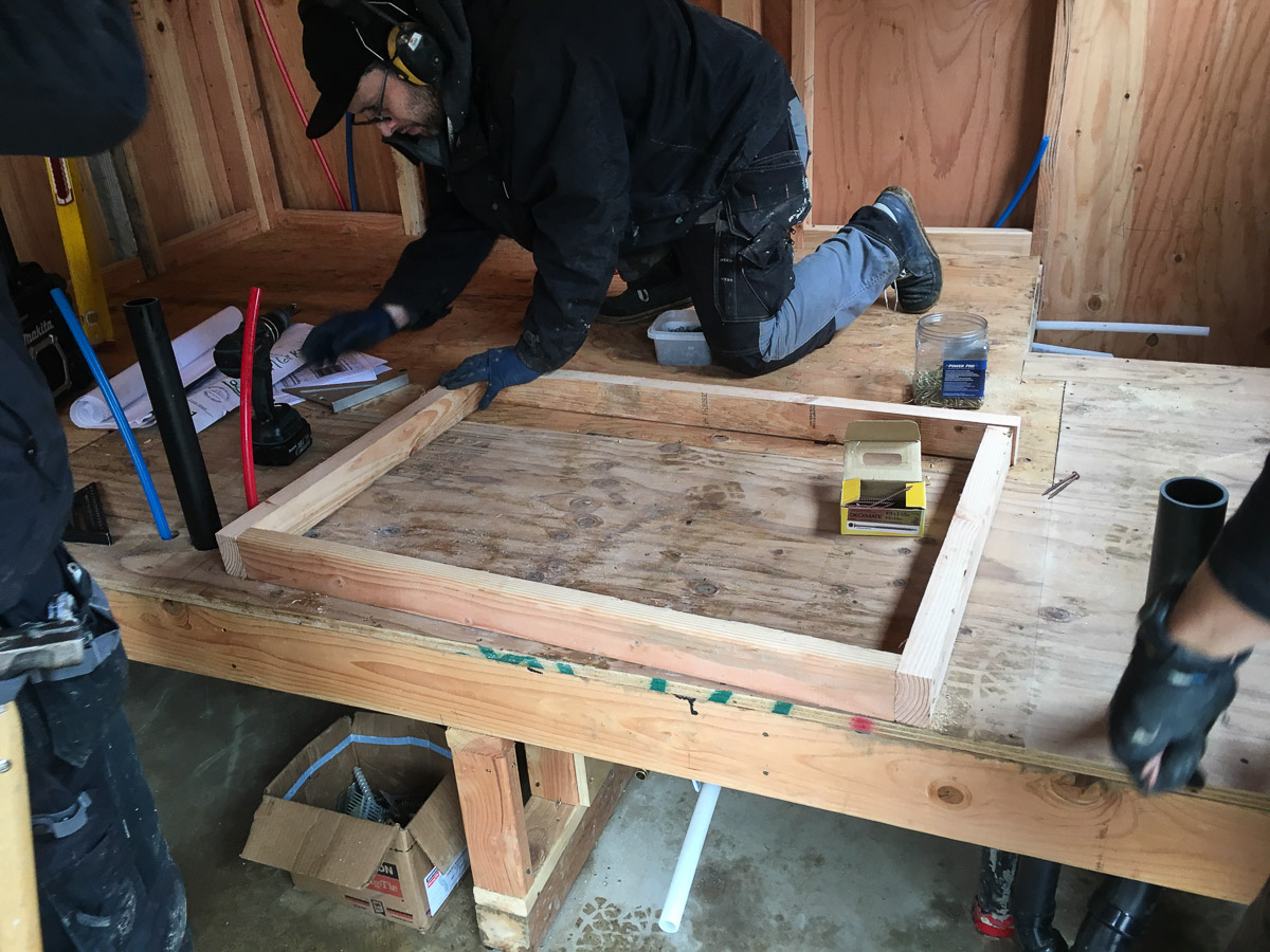There were are couple of options for the floor/wall sequence. i) Install the internal wall framing then lay down plywood sheathing (3/4″) between the walls. ii) Install the floor sheathing in one continuous run and then build the walls on top of the floor sheathing. The builder recommended ii) floor sheathing first – there are several advantages – better isolation of the bathroom and kitchen from the utility space and bed storage area below. Better floor strength.