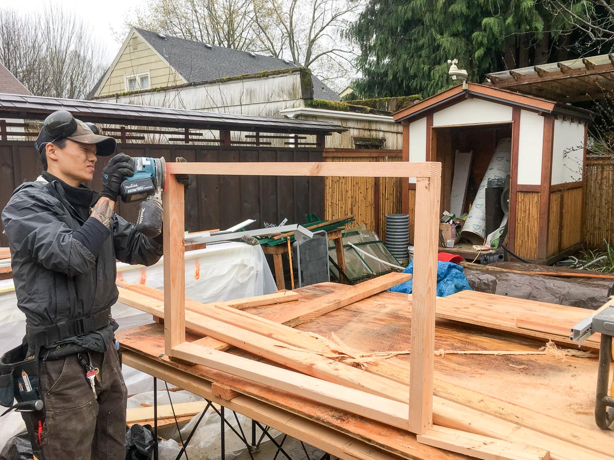 The window and door openings were not framed with bucks to extend out past the exterior insulation layer as I only made the decision between innie/outie windows after the structural framing was complete. So the first task was to build frames to extend out the door and window openings.