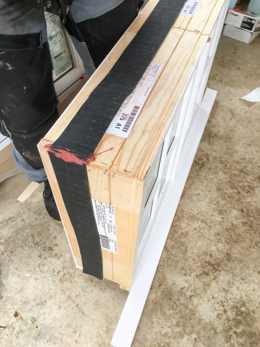 The Tremco tape can be ordered in 3 different thickness, each thickness being rated for a different sized gap between the window frame and the rough-opening: 3/16” – 3/8” gap, 1/4” – 9/16” gap, and 3/8” – 3/4” gap. I had a range of gap sizes so I went with the smallest thickness tape. As it turned out this was a very tight fit (too tight) around the door, good fit for the small kitchen window and the sides of the large window, and way too small for the bottom and top gaps on the large window. It only comes in lots of 3 rolls and it’s expense to order a bunch of different sizes for a one-off project like mine. So my suggestion is when sizing your windows/doors and rough-openings, try to keep the gaps top/bottom/sides consistent so you can use just one variant of Tremco tape. If you end up with a large gap as I did on the large living room window then you can always use spray-foam after the window is installed to complete the gap sealing.