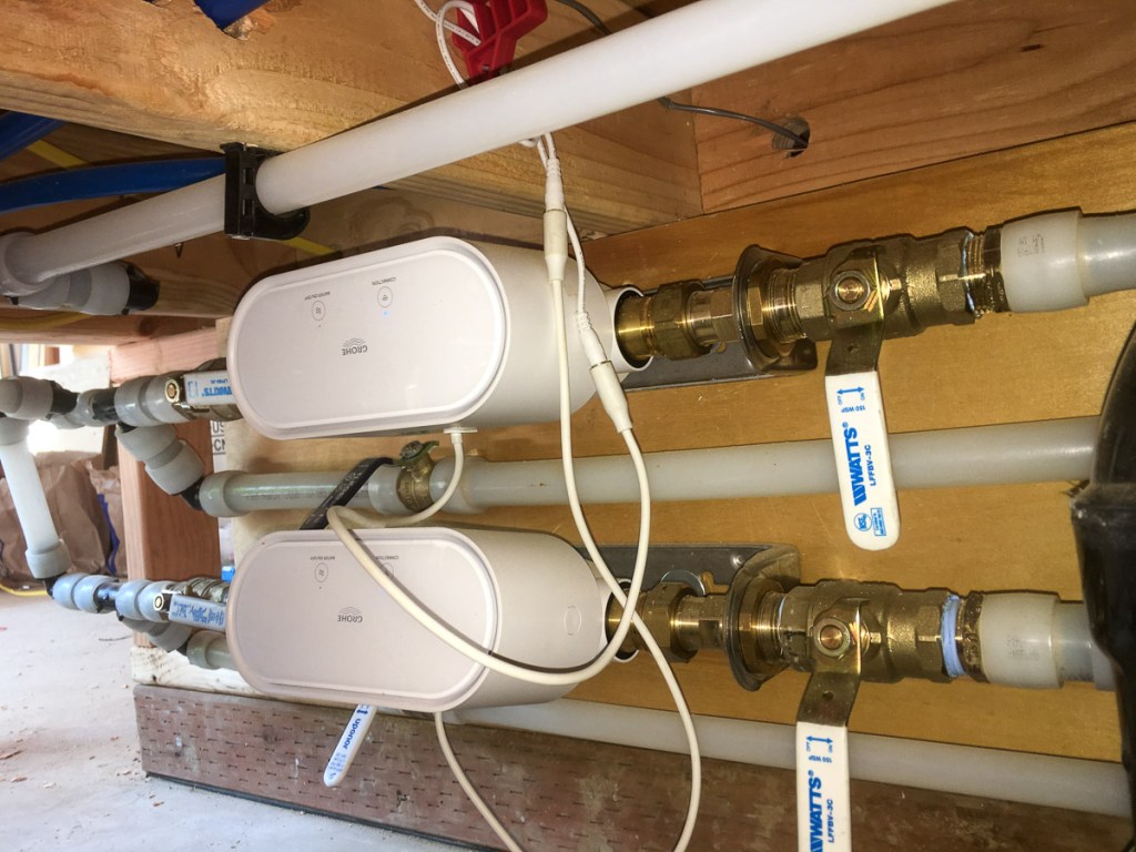 As the hot water cylinder will be buried away in the dead-corner of the kitchen cabinets I wanted to be able to detect water leaks and automatically shutoff the water. I went with Grohe’s Sense Guard system. I needed two of these for the City Water and Rainwater supplies. There are a bunch of valves so each unit can be bypassed and maintained.