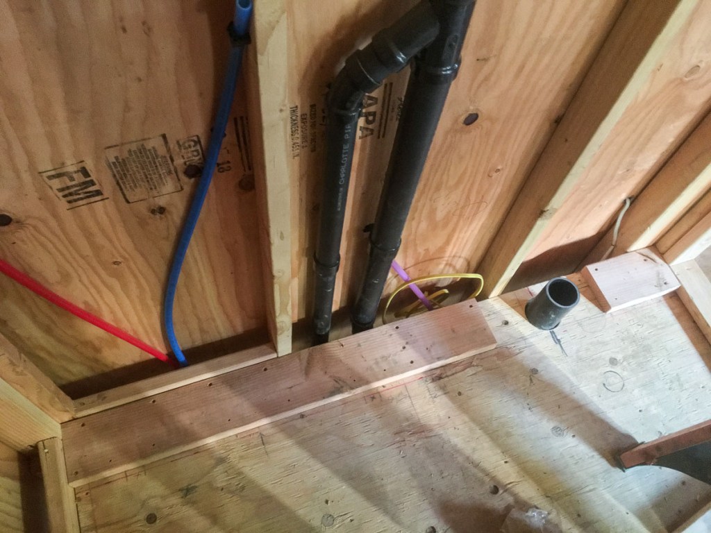 The toilet and shower are vented through the roof. The roof penetration was sealed using a Roflex 30 gasket from 475 High Performance Building Supply and this was then sealed with Prosocco liquid membrane. The basin, kitchen, and laundry drains are vented using Air Admittance Valves as there was not enough room to run vents through walls.