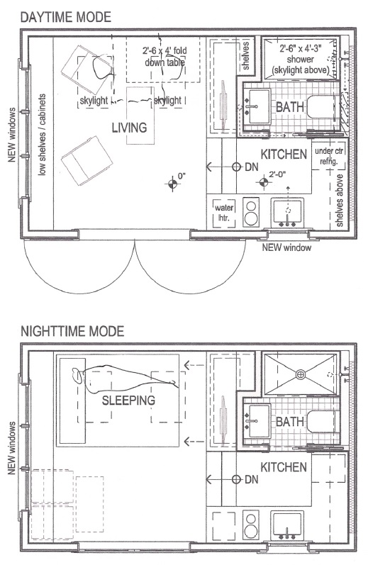 His breakthrough idea was to locate the kitchen and bathroom on a 2 ft high platform with 3 steps leading up from the living area to the kitchen. The queen-sized bed would stow away under the platform creating a living space during the day, converting to a bedroom at night.