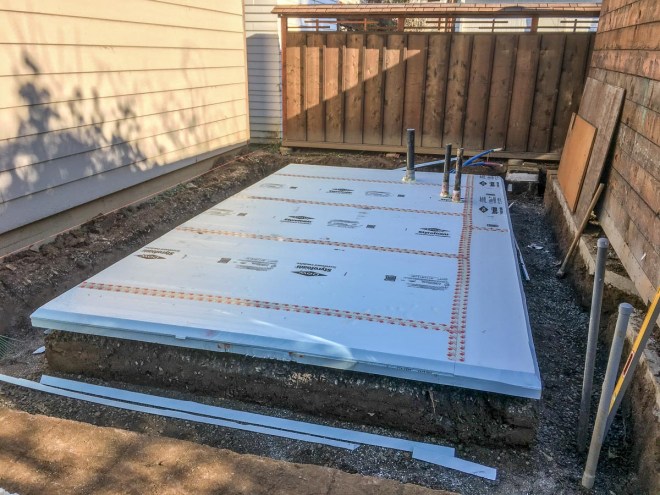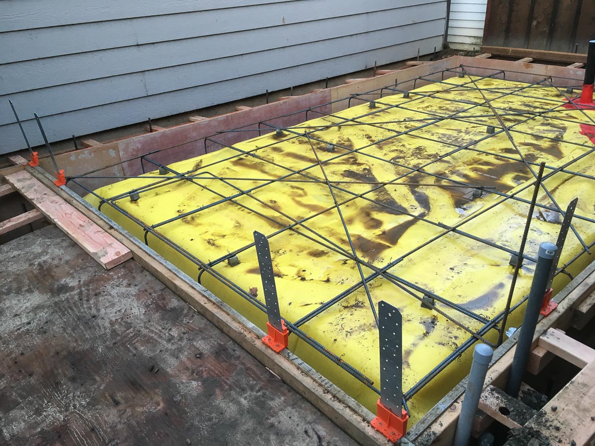The first section contains the inspection codes you might need to call before pouring the slab. I called BDS and we worked out that I needed 215-Setbacks, 230-Reinforcing/Concrete, and 227-Grounding Electrode. But then the inspector is a different person with different ideas about what codes are needed plus they can see the actual situation on site. I probably should have filled in the paperwork for 200-erosion control as we were shifting dirt around, although I slipped by that one as it was an existing structure. The inspector commented I was doing a good job on that. He asked to see the paperwork for the survey markers on the property line so he could check the setbacks. I had a survey done 2 years ago before building the back fence however I hadn’t paid the ~$400 to get this formally registered with the city. I was able to get through that by explaining it was an existing structure and I was putting it back (was required to put it back) exactly where the original building had been. (However if you are building a new ADU, then you need to be prepared for the City to insist on formal survey documentation.) He asked about an insulation code – however there was no insulation code listed in the pre-pour section so I’d never requested one. I told him there was a complete insulation system that would be inspected later and he didn’t push that any further. He commented that the builder had done an excellent job on the foundation prep and formwork.