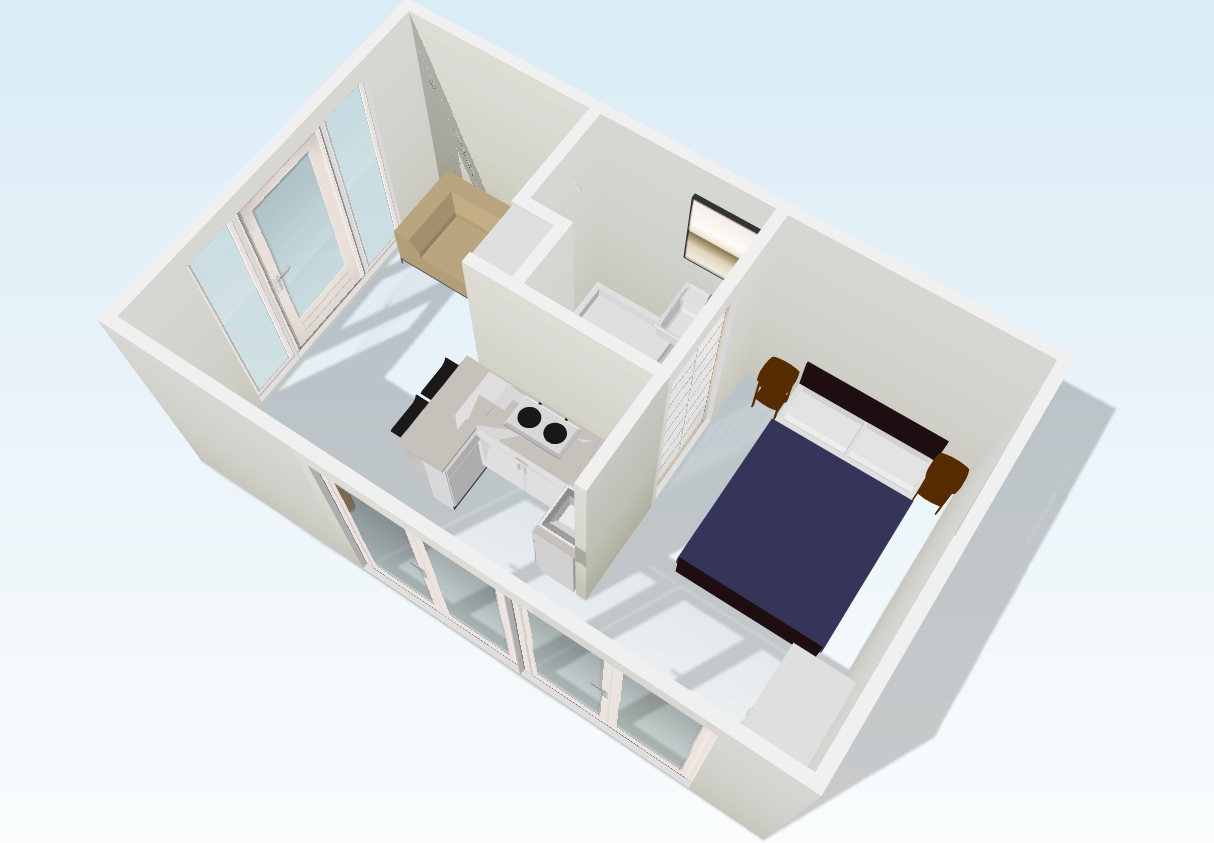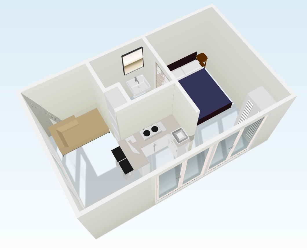 My first design attempt was separate rooms – living, kitchen, bedroom, bathroom – squashed into the 200 sq ft area. I used the floorplanner.com free online tool to create these plans.