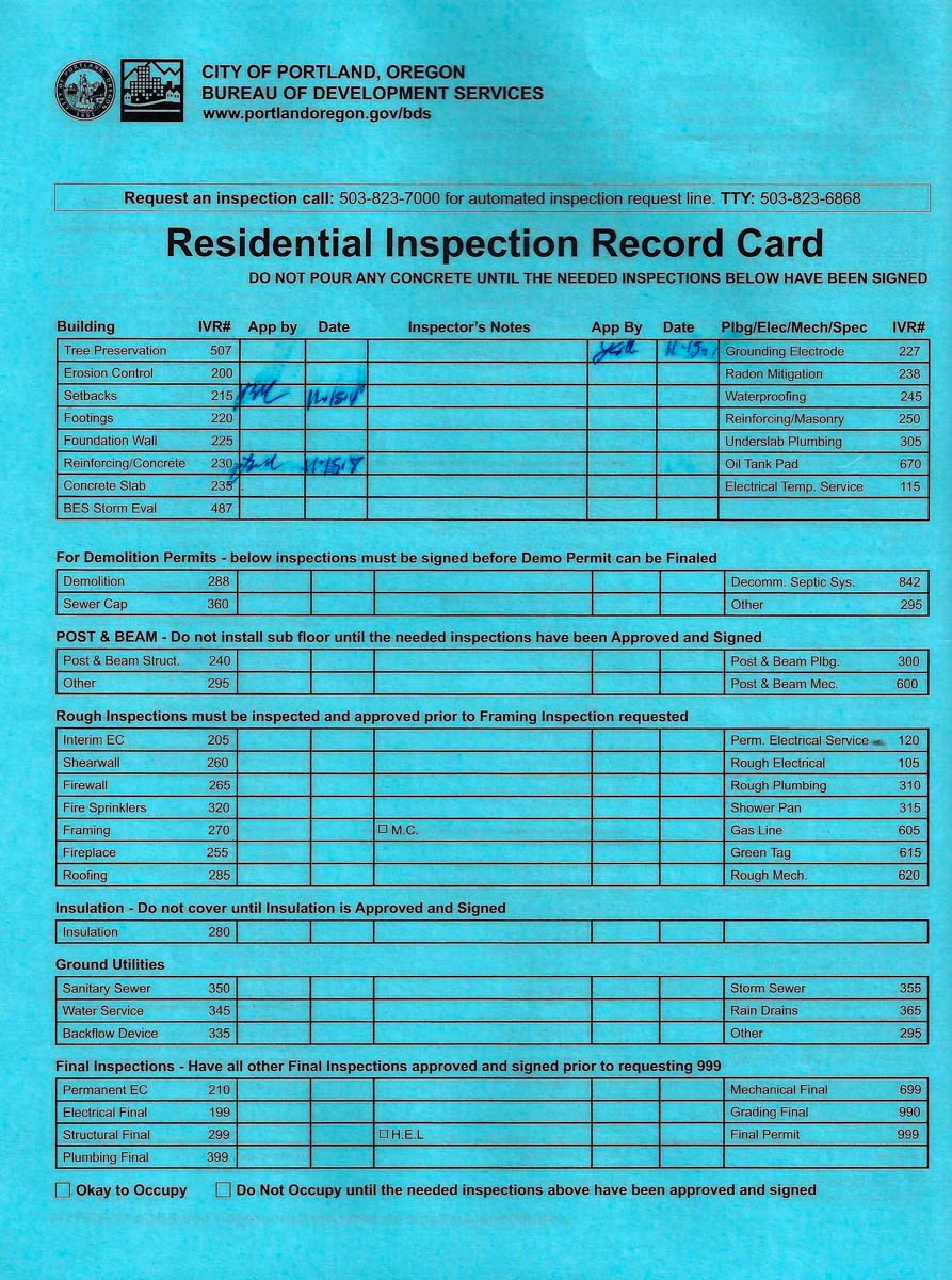 The building permit comes with a blue “Residential Inspection Record Card”. It’s really important to get every inspector to sign off this sheet even for trade permits that contractors have raised.