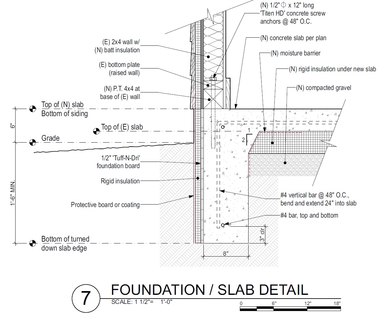 The new slab will be an edge-thickened slab; a 4-inch reinforced concrete slab thickened to 8-inches around the perimeter and extending 1-1/2 feet down, so below Portland’s freeze depth. It will also extend 6-inches above grade putting an end to the water penetration problems. The layers are undisturbed soil, 4-inches compacted gravel, 4-inches XPS foam insulation, a moisture/radon barrier, then concrete.