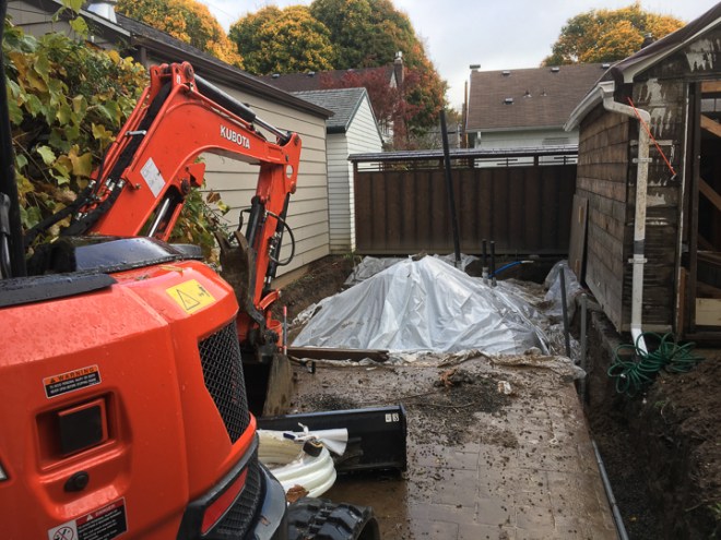 The wet fall weather meant we had to keep the foundation area covered with plastic to prevent the soil getting too saturated. It’s partly a cost issue as you pay for soil disposal by weight. Also mud makes a difficult working environment.