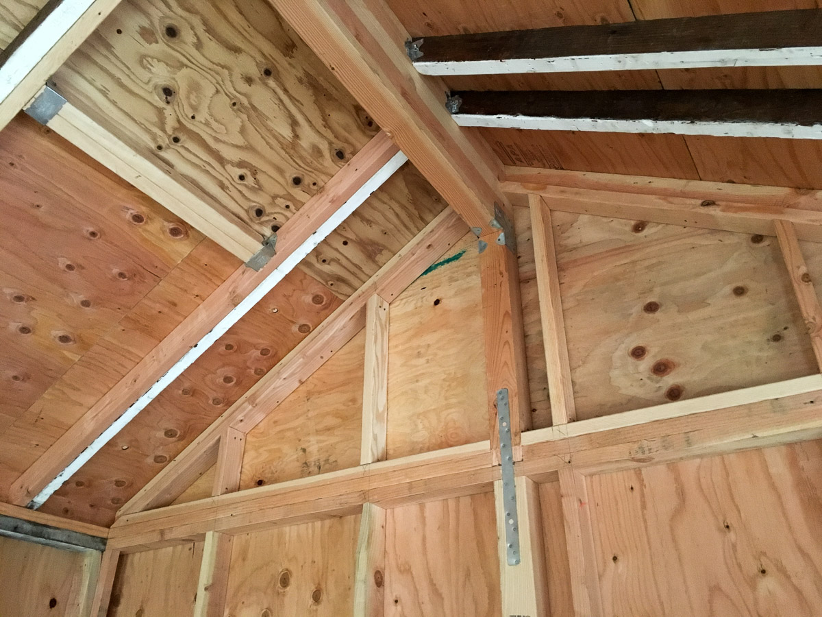 The roof sheathing was laid horizontally to maximize the number of rafters tied together by each sheet.