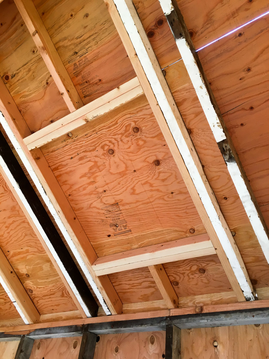 The main changes to the existing Garage framing was the installation of a 4×12 Glulam beam which will become an exposed feature running the length of the ADU. The rafters had to be cut down to fit against the new beam. An extra sillplate was added at the top of the wall as the existing sillplate was looking gnarly.